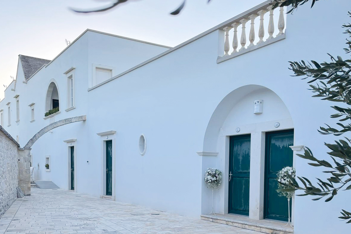 Located in the main manor house, the Olive Grove Rooms overlook the entire estate and its centuries‑old olive trees. Exposed tuff stone and “carriage‑sky” vaulted ceilings add airy elegance, complemented by custom Italian décor. Ideal for guests who desire luxury rooms in Puglia with panoramic olive‑grove views, a serene haven just steps from your wedding celebration.