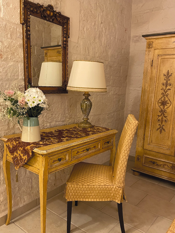 Our Masseria Rooms showcase traditional Puglian style: white tuff‑stone walls and graceful barrel‑vaulted ceilings. Hand‑painted wooden furniture in warm earthy tones enhances the authentic charm, while premium mattresses and luxury linens ensure a restful stay. Perfect for those seeking traditional masseria accommodation in Puglia.