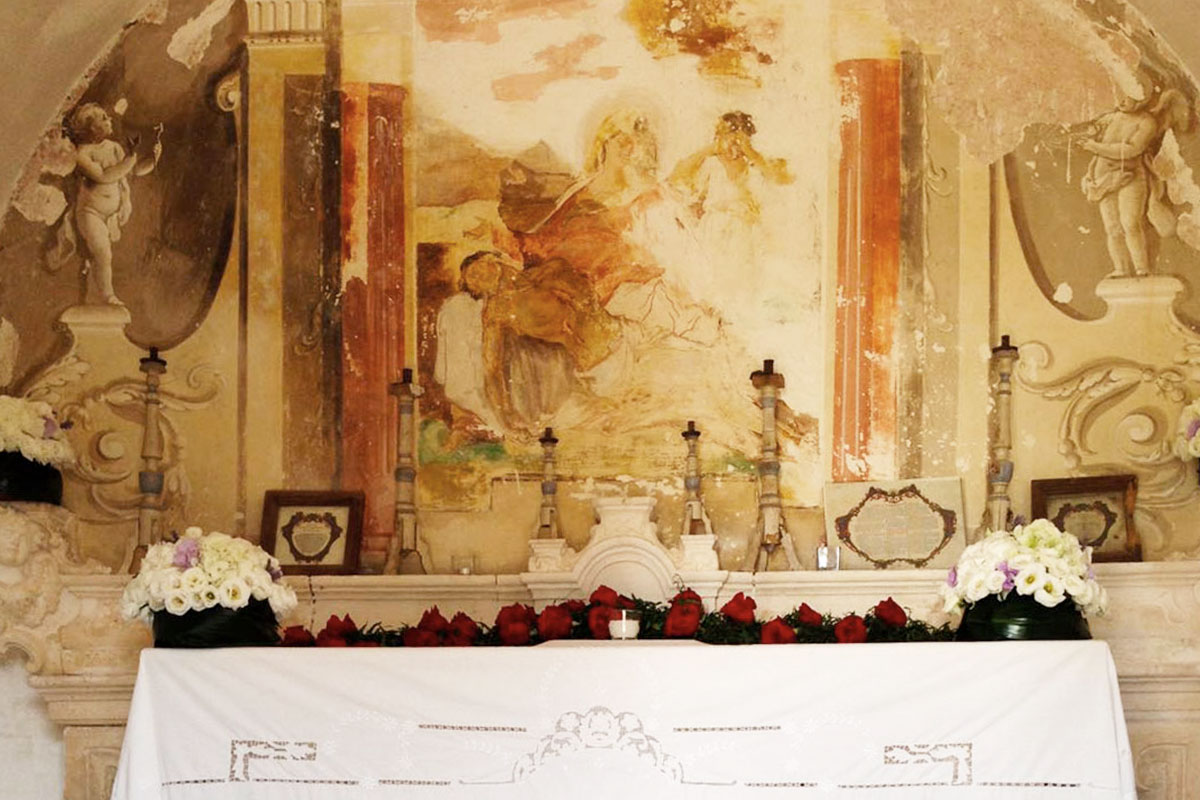 At the heart of the estate lies a modest, serene chapel holding a local stone altar. Above it is a poignant fresco of the Deposition of Christ, likely the work of Domenico Carella, renowned for his art in Martina Franca’s Ducal Palace, or one of his devoted pupils, an artwork that speaks of shared faith, art, and divine beauty.